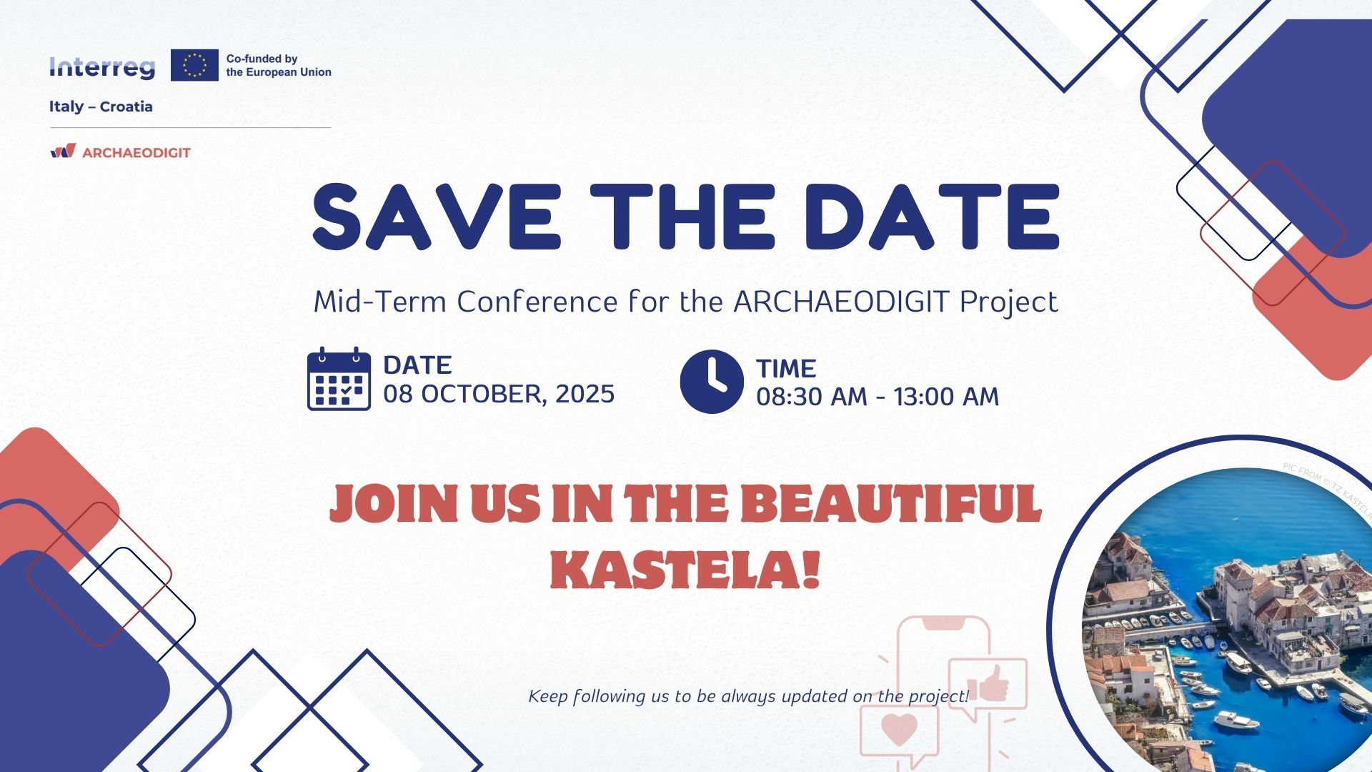 We are delighted to announce that the Mid-Term Conference of the EU-funded project ARCHAEODIGIT – ARCHAEOlogical DIGITal paths for an inclusive and sustainable tourism will be held on Wednesday, 8 October 2025, in the historic town of Kaštela, Croatia. For those unable to attend in person, the conference will also be available via online streaming, ensuring broad accessibility and participation from across the Adriatic-Ionian region and beyond.
