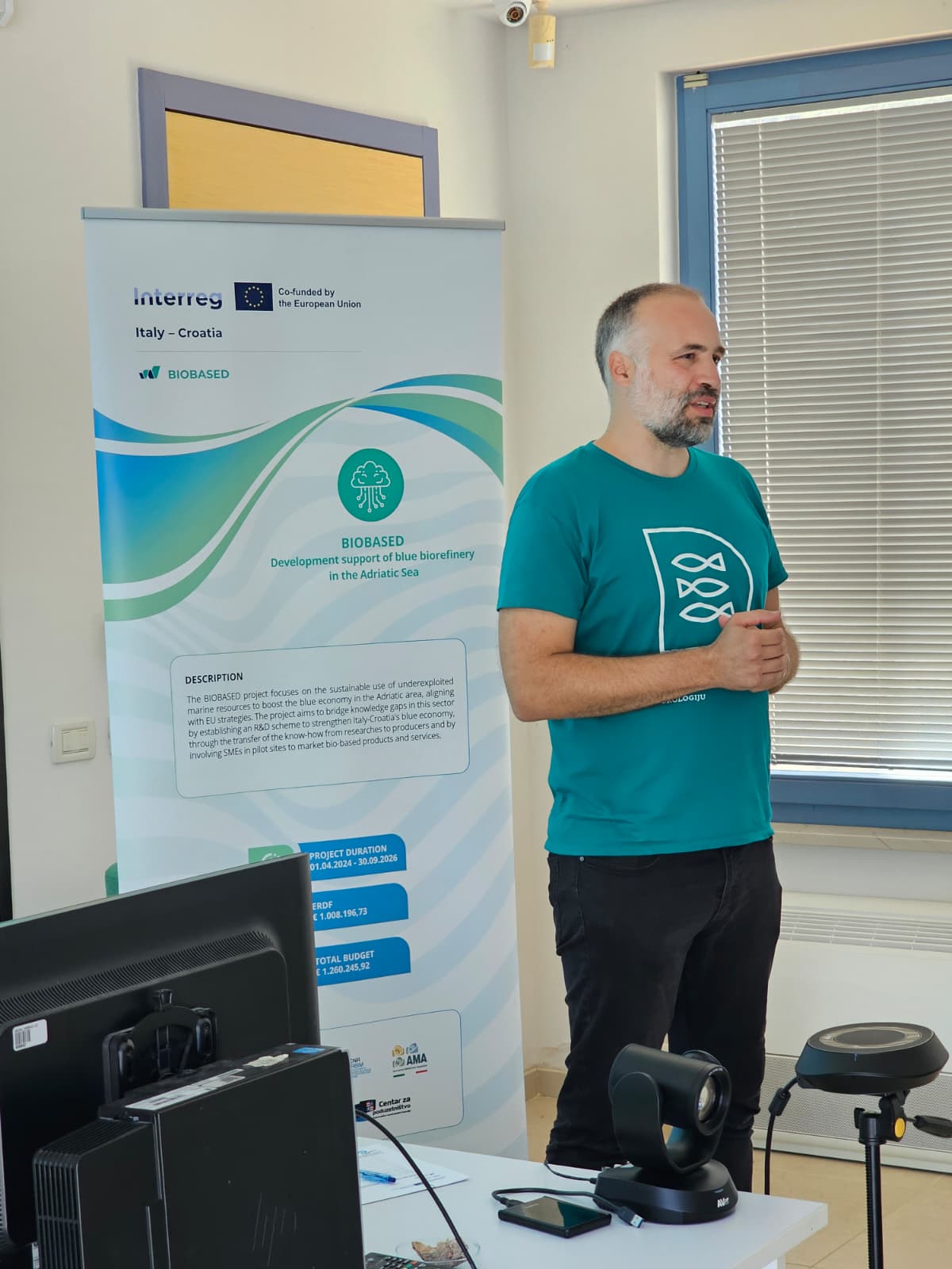 In the afternoon, the first Networking Event took place in the same venue, bringing together project partners and cross-border stakeholders from Croatia and Italy, including SMEs, research representatives, an environmental NGO, and a Fisheries Local Action Group. The programme included a thematic presentation on IMTA with a focus on algae–bivalve systems delivered by Prof. Kruno Bonačić, followed by Prof. Matteo Francavilla’s overview of European seaweed development perspectives. Partners presented the implementation of pilot actions in Gargano, Cattolica and Mali Ston Bay, highlighting expected environmental and economic benefits and the importance of shared monitoring approaches across sites. A dedicated contribution also emphasized the role of SMEs in supporting long-term uptake and market-oriented application of IMTA solutions.