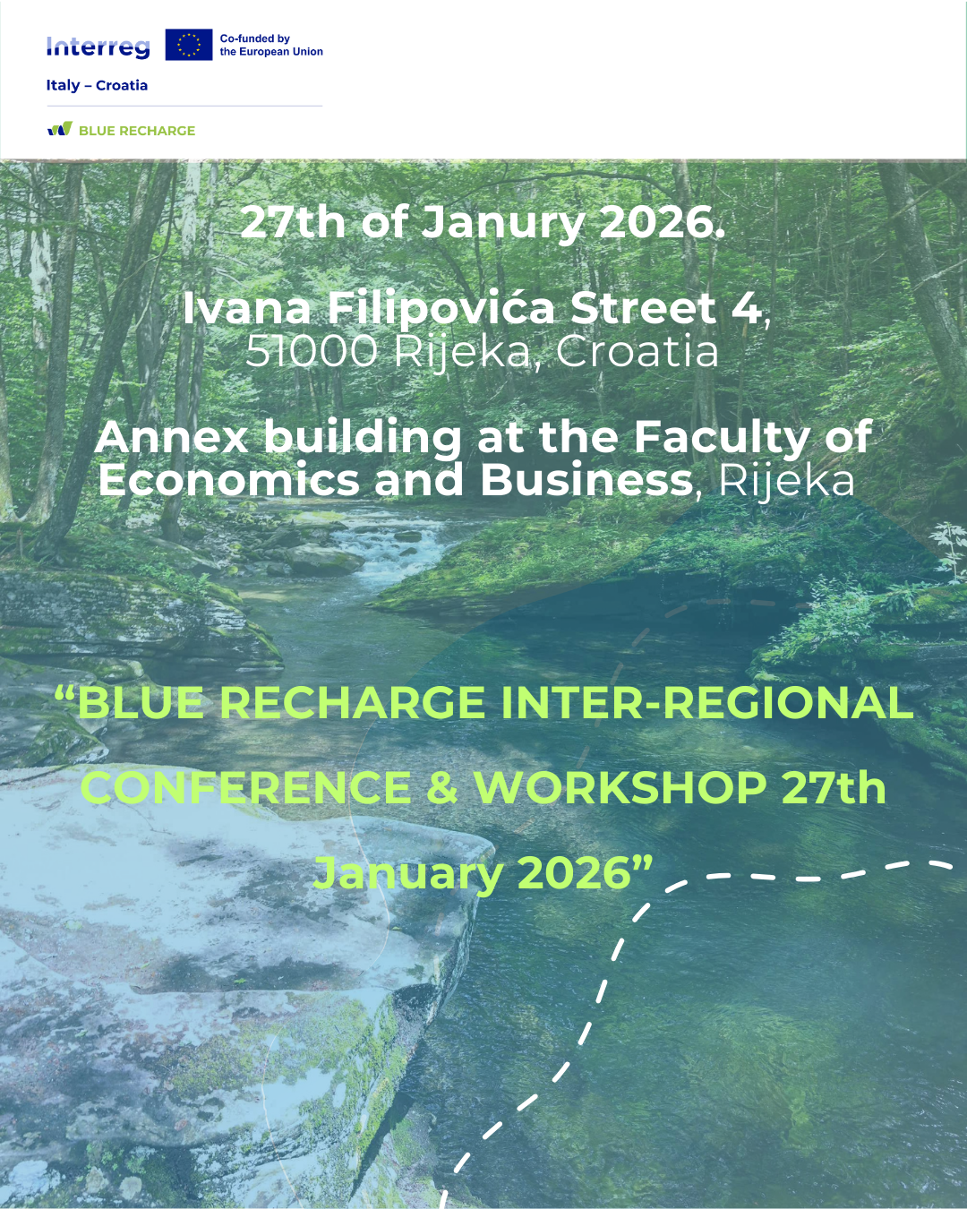 The inter-regional conference and workshop BLUE RECHARGE will be held on 27 January 2026 in Rijeka, with a focus on sustainable groundwater management and the development of Blue Credits schemes aimed at promoting aquifer recharge. Through plenary lectures, thematic sessions and a concluding discussion, participants will be presented with the results of pilot actions in Croatia and Italy, the economic dimensions of water resource management, and the potential for transferring project outcomes to other Mediterranean regions. The conference will take place at the Faculty of Economics and Business in Rijeka, with the possibility of following the programme online; all necessary access information is provided in the agenda document.