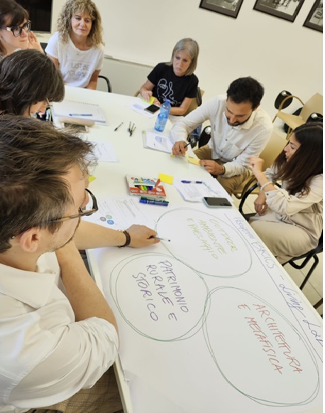 The participants suggested and shared personal proposals relating to the main identity elements of the territory and then the groups worked on merging the proposals and building connections and insights to build a first map of territorial landmarks.