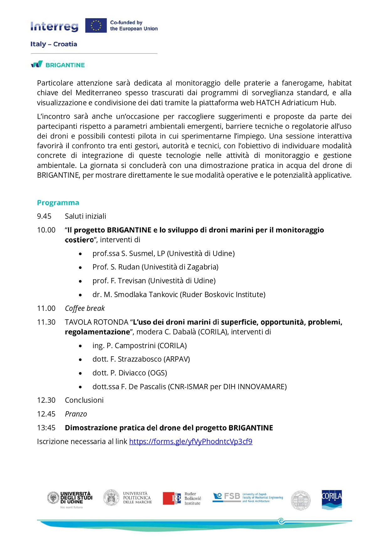 The workshop offers a full day of discussion and demonstration. It opens with an introduction to the BRIGANTINE project and its marine drones for coastal monitoring . A round table follows, bringing together experts from environmental agencies, port authorities, and research institutions. They discuss opportunities, technical challenges, and regulatory aspects related to the use of autonomous surface vehicles . Special attention is given to monitoring seagrass meadows, key habitats in the Mediterranean often overlooked by standard programs . Participants also explore how environmental data can be shared through digital platforms such as the HATCH Adriaticum Hub . In the afternoon, the event moves from theory to practice with a live demonstration of the BRIGANTINE drone in water, showing its operational capabilities and real-world applications.