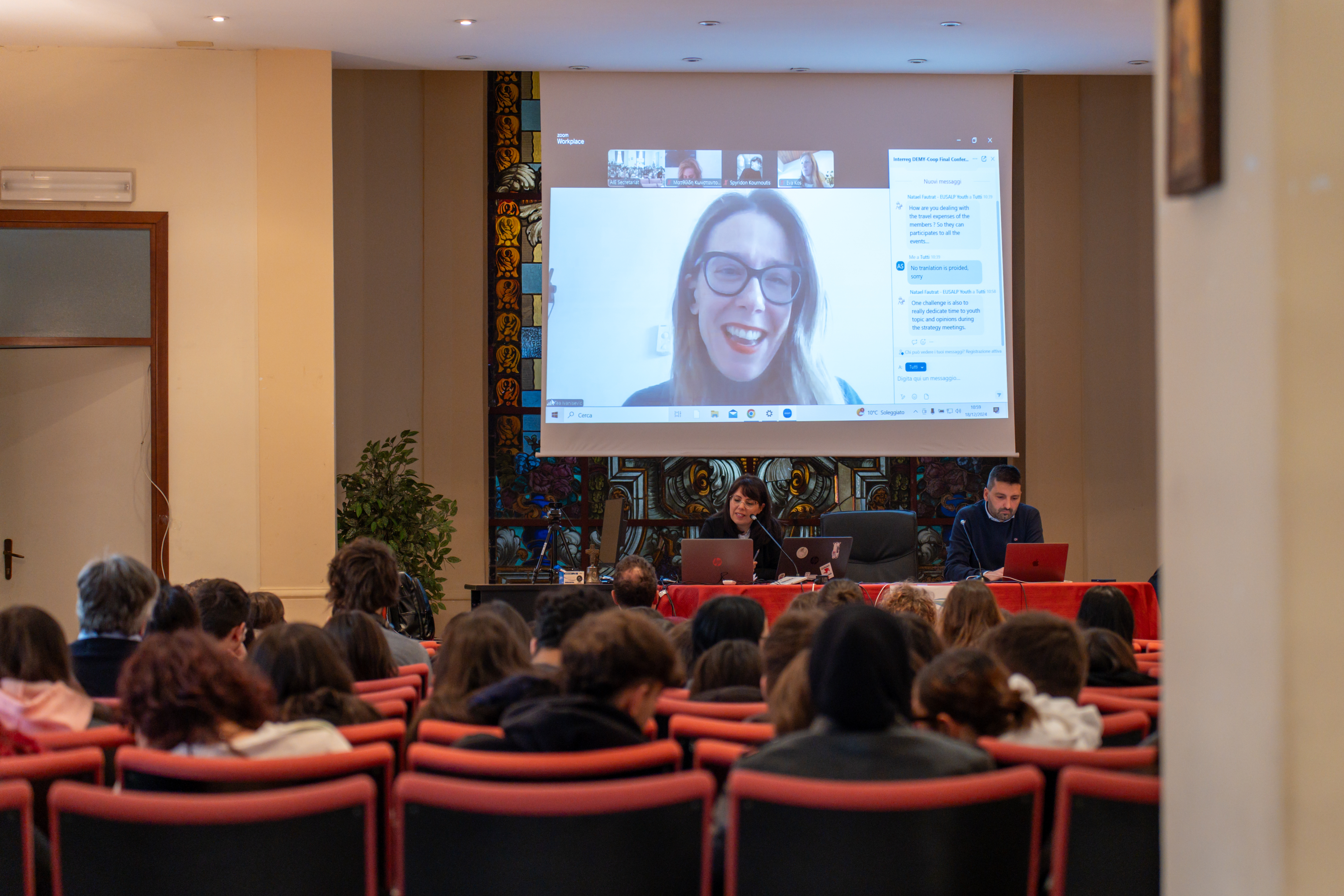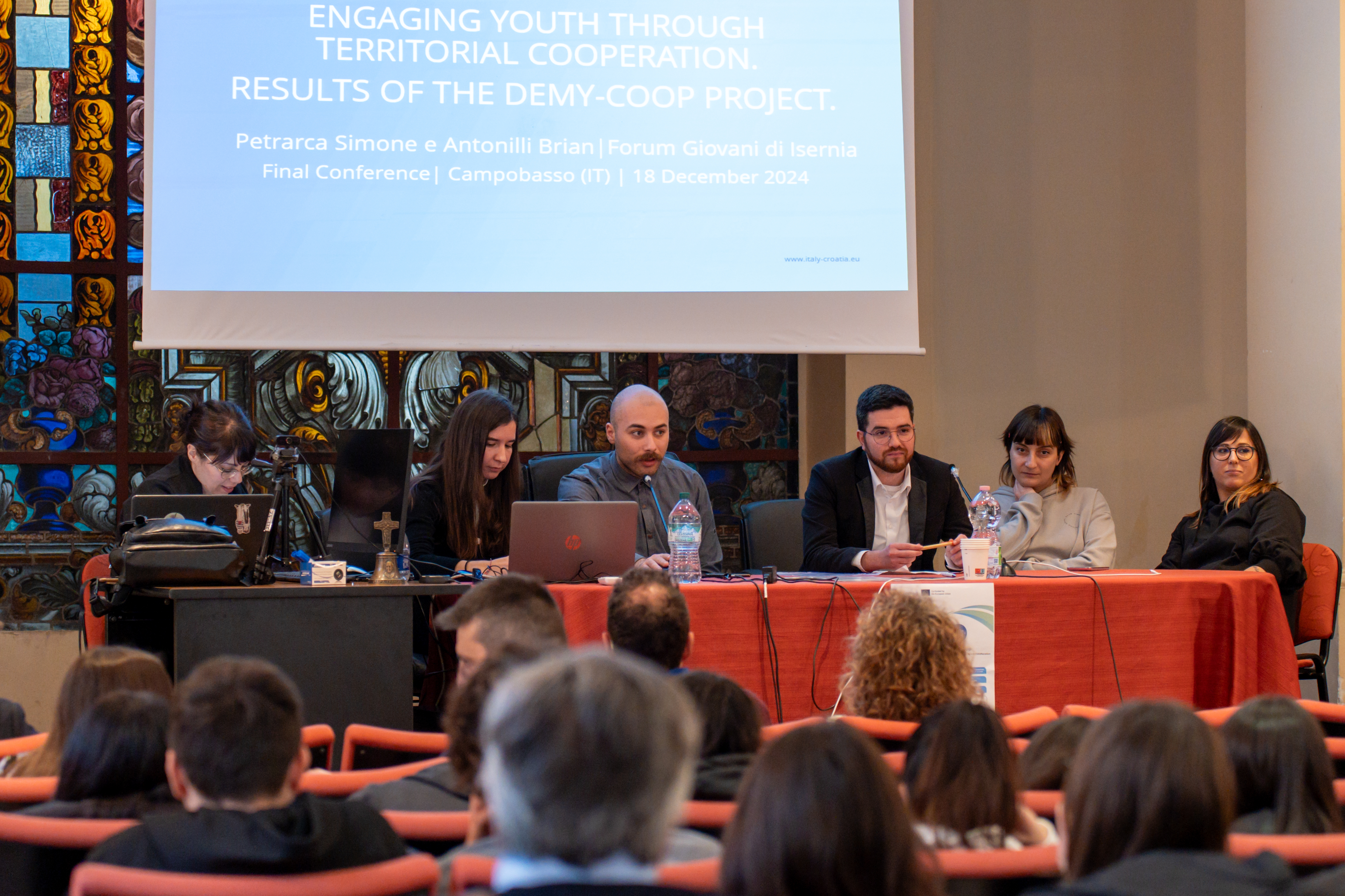The DEMY-Coop Final Cross-Border Conference was quite successful and involved more than 100 attendees, mostly high-school students, as well as three local youth organisations: giovanichimere Forum Giovani Città di Isernia and Fuori Teca. These three very different organisations were invited to learn about EU projects and Territorial Cooperation, while getting the chance to connect and network also in view of possible future collaboration. The three organisations presented their priorities and objectives and explained how through collective engagement young people can voice and turn their opinions, hopes and ambitions into action