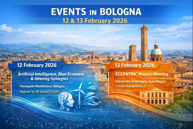 12 February 2026 – Artificial Intelligence, Blue Economy and Interreg Synergies Location: Tecnopolo Manifattura, Bologna Registration deadline: 30 January 2026 13 February 2026 – ECCENTRIC Project Meeting Location: University of Bologna, Aula Magna (Via del Risorgimento 2) Agenda and registration available via the official links.