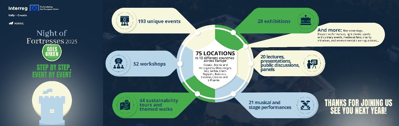 The 2025 edition brought together 75 cultural sites across 10 European countries – Croatia, Bosnia and Herzegovina, Montenegro, Slovenia, Serbia, Czech Republic, Romania, Lithuania, Ukraine, and for the first time, Italy. The Night of Fortresses Goes Green event is part of two EU-funded projects implemented by Fortress of Culture Šibenik. The first, GIFTSnet – Network for Green and Inclusive Fortified Tourism Solutions, is financed through the Interreg IPA Croatia – Bosnia and Herzegovina – Montenegro 2021–2027 program. The second, FORTIC – From the Remains of War to the Architecture of Peace in the Cross-Border Area of Italy-Croatia, is supported by the Interreg Italy-Croatia 2021–2027 program. Thanks to cross-border collaboration through the FORTIC project, the event expanded to new locations in both Croatia and Italy.
