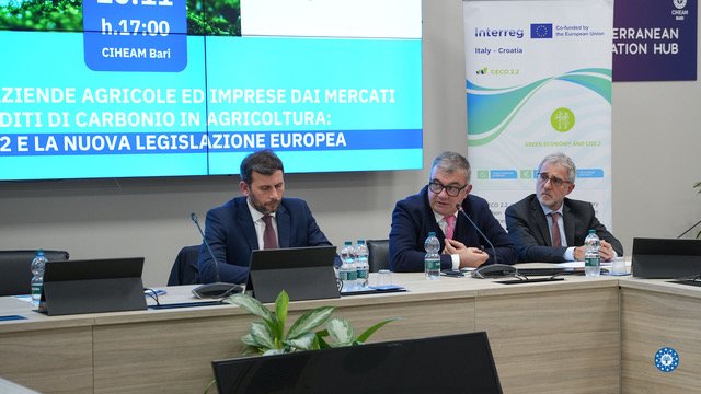The event – organised by CIHEAM Bari, partner of GECO 2.2, in collaboration with the Department of Agriculture, Rural Development and Environment of the Puglia Region, associate partner of GECO 2.2, and with the patronage of ODAF Bari – provided a valuable platform for discussion on key aspects of voluntary carbon credit markets in agriculture.