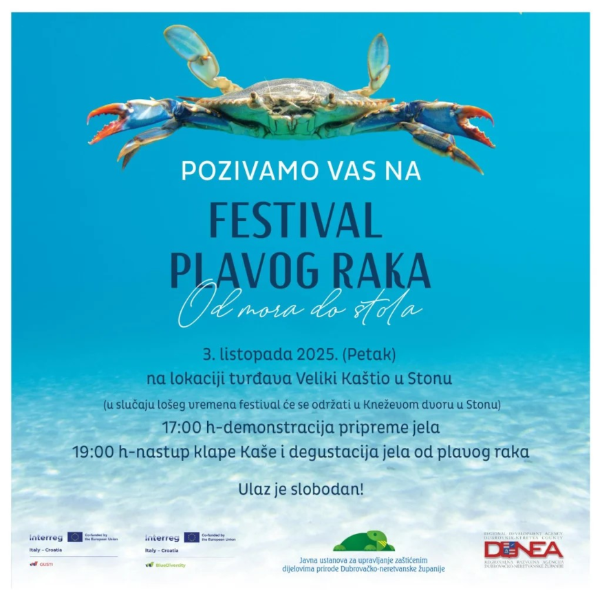 The Regional Development Agency of the Dubrovnik-Neretva County - DUNEA, as part of the GUSTI project - Gastro UpScaled Tourist Itinerary in Rural Areas of Croatia and Italy, invites you to the culinary workshop "Sweet Heritage of Pelješac", which will be held as part of the Blue Crab Festival, organized by the Public Institution for the Management of Protected Nature Areas of the Dubrovnik-Neretva County, on Friday, October 3, 2025, at the Veliki Kaštio fortress in Ston, starting at 5:00 PM.