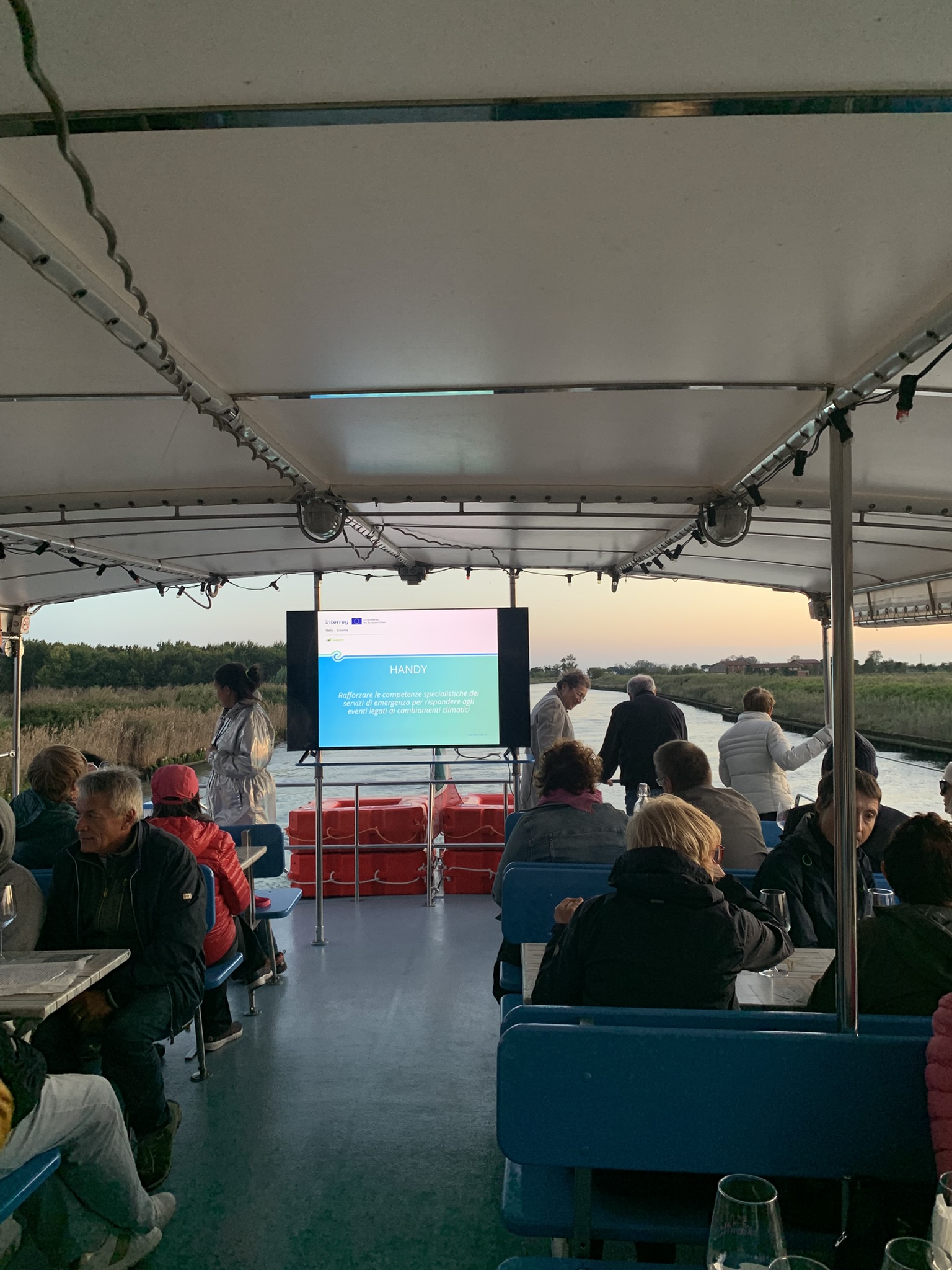 On 28 September 2025, the Municipality of Aquileia, partner of the HANDY project, presented its training results and main activities carried out during the past months. The initiative took place on board a river boat “Battello Santa Maria” in the Aquileia-Grado lagoon, creating a unique atmosphere for sharing knowledge. Over 40 participants took part in the initiative, including the Mayor, Mr. Emanuele Zorino, the Deputy Mayor, Mr. Isaac Zampieri, and other members of the municipal administration, as well as numerous citizens.