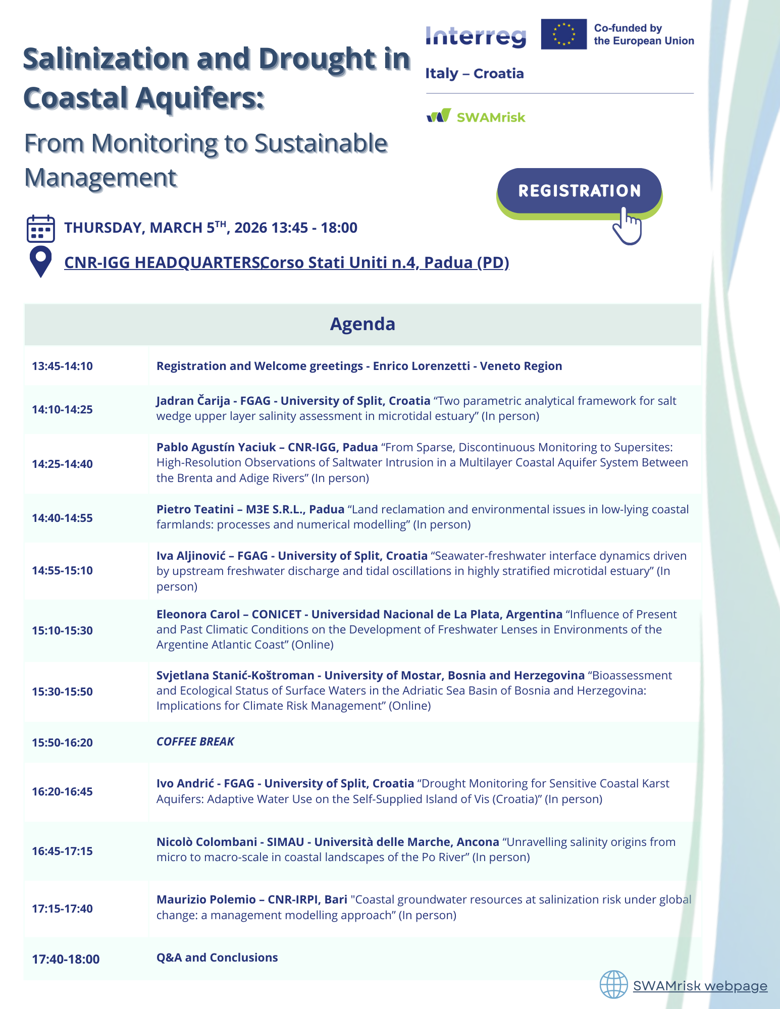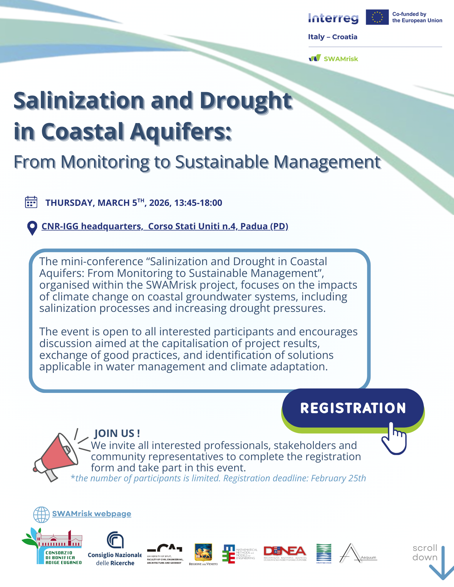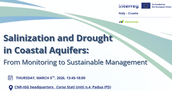 Within the framework of the Interreg Italy–Croatia SWAMRISK project, a mini-conference entitled “Salinization and Drought in Coastal Aquifers: From Monitoring to Sustainable Management” will be held on Thursday, 5 March 2026, at the CNR-IGG Headquarters in Padua. The number of participants is limited. Registration is required and can be completed via the link provided in this announcement or through the registration form available in the event flyer until February 25th.