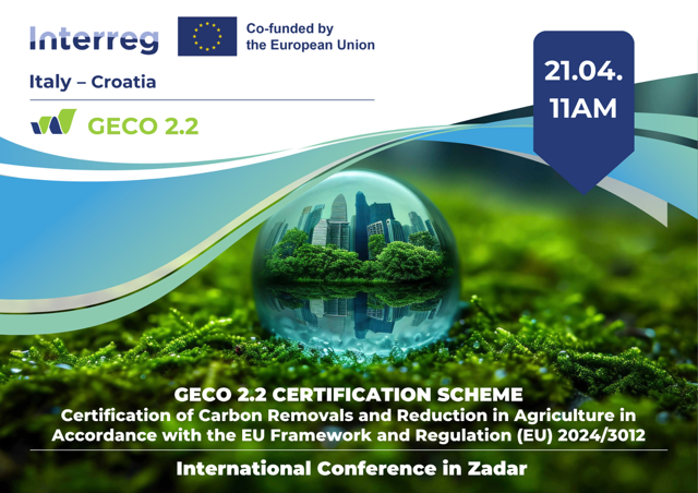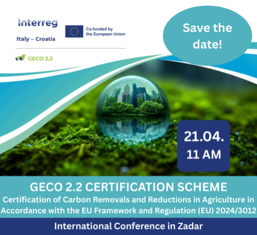 On 21 April 2026 at 11:00 AM, the international conference “GECO 2.2 CERTIFICATION SCHEME – Certification of Carbon Removals and Reductions in Agriculture in Accordance with the EU Framework and Regulation (EU) 2024/3012” will take place at the University of Zadar (Croatia).