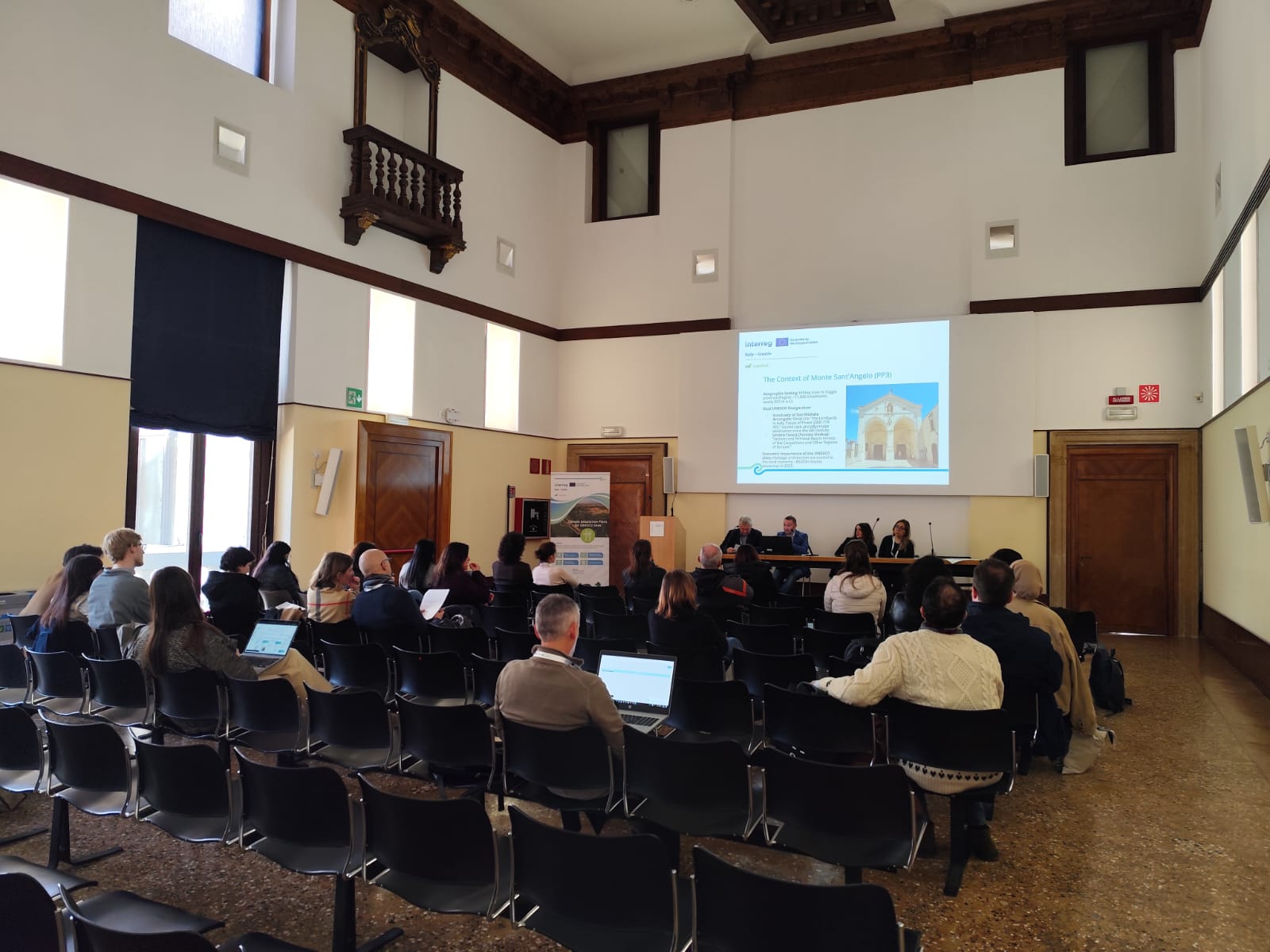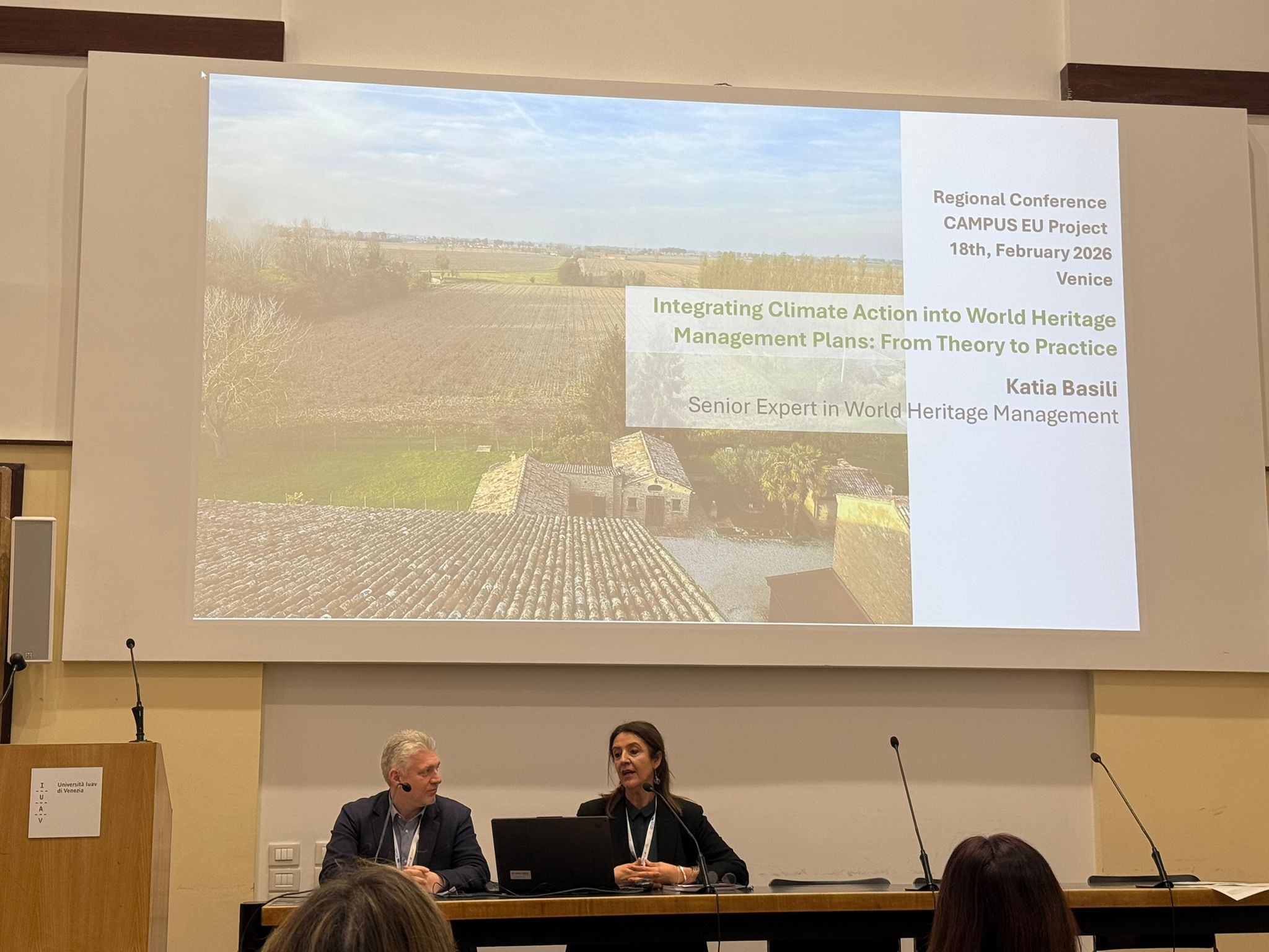 On the 18th of February 2026, the University of IUAV hosted the 2nd Regional Conference of the CAMPUS project, in Venice. The event gathered project partners, institutions and UNESCO heritage experts to present methodologies and first results on Climate Adaptation Plans (CAPs) for World Heritage Sites in the Italy–Croatia area. Opened by professor Trovò, the conference stressed that climate change must be structurally integrated into UNESCO Management Plans and multi-level governance systems, rather than addressed as a sectoral issue. CAMPUS was presented as a process linking climate risk analysis to operational planning through three main components: risk and vulnerability assessment, development of CAPs, and identification of measures and pilot actions. The keynote speech, held by Katia Basili - Senior Expert in World Heritage Protection and Management, highlighted the need to move from risk awareness to systematic implementation within management frameworks, overcoming fragmented governance and the lack of measurable climate indicators. Examples such as Ferrara and Vicenza and the Palladian Villas of the Veneto showed how climate integration can strengthen site governance. The IUAV team illustrated the multi-risk methodology developed in the framework of CAMPUS combining hazard, exposure and vulnerability analyses, applied to the sites of Ferrara and the Po Delta, Sanctuary of Monte Sant'Angelo, Trogir, Stari Grad Plain and Plitvice Lakes National Park. The approach supports priority-setting and provides a replicable framework for heritage adaptation. Living Labs were presented as key participatory tools: in Ferrara, three workshops generated around 80 adaptation measures for the draft of the CAP, while the “Future Keepers” initiative, which will be launched in March, will be engaging young people to approach the Outstanding Universal Value of the UNESCO site and learn how to contribute to its preservation. The draft CAP for Ferrara includes 61 measures and a monitoring system up to 2031, while further work in the Po Delta addresses subsidence, salinisation and coastal flooding. In Croatia, feasibility studies in Trogir and Stari Grad highlighted rising temperatures and flood risks, with around 38% of residents and 39% of heritage assets exposed. The conference reaffirmed that climate change is a structural challenge for UNESCO sites and that integrated, participatory and operational adaptation planning is essential to ensure their long-term resilience.