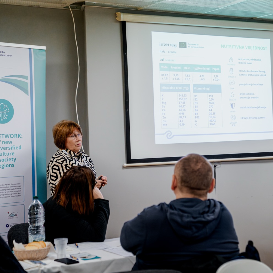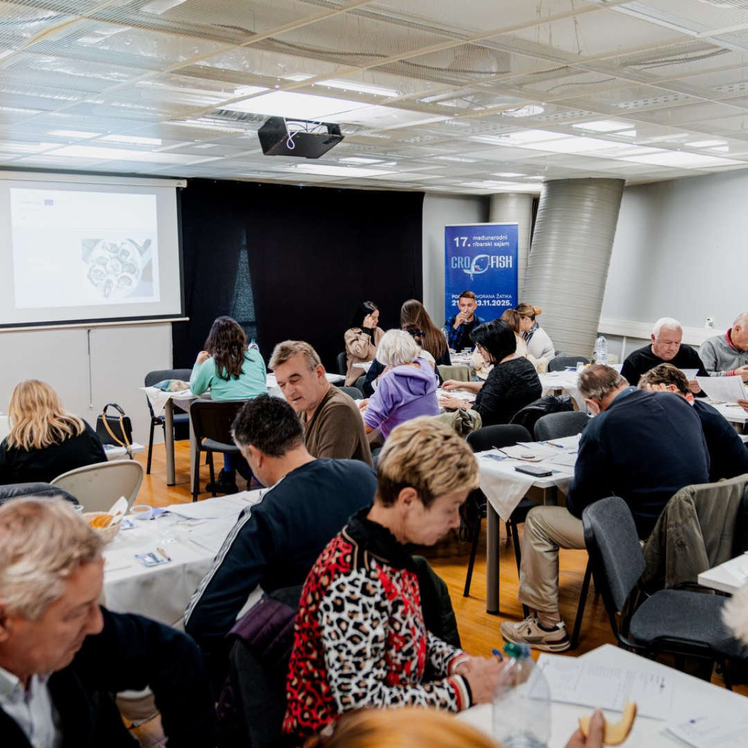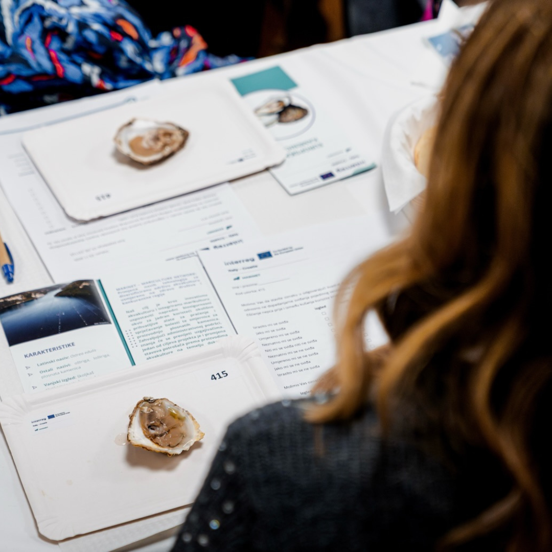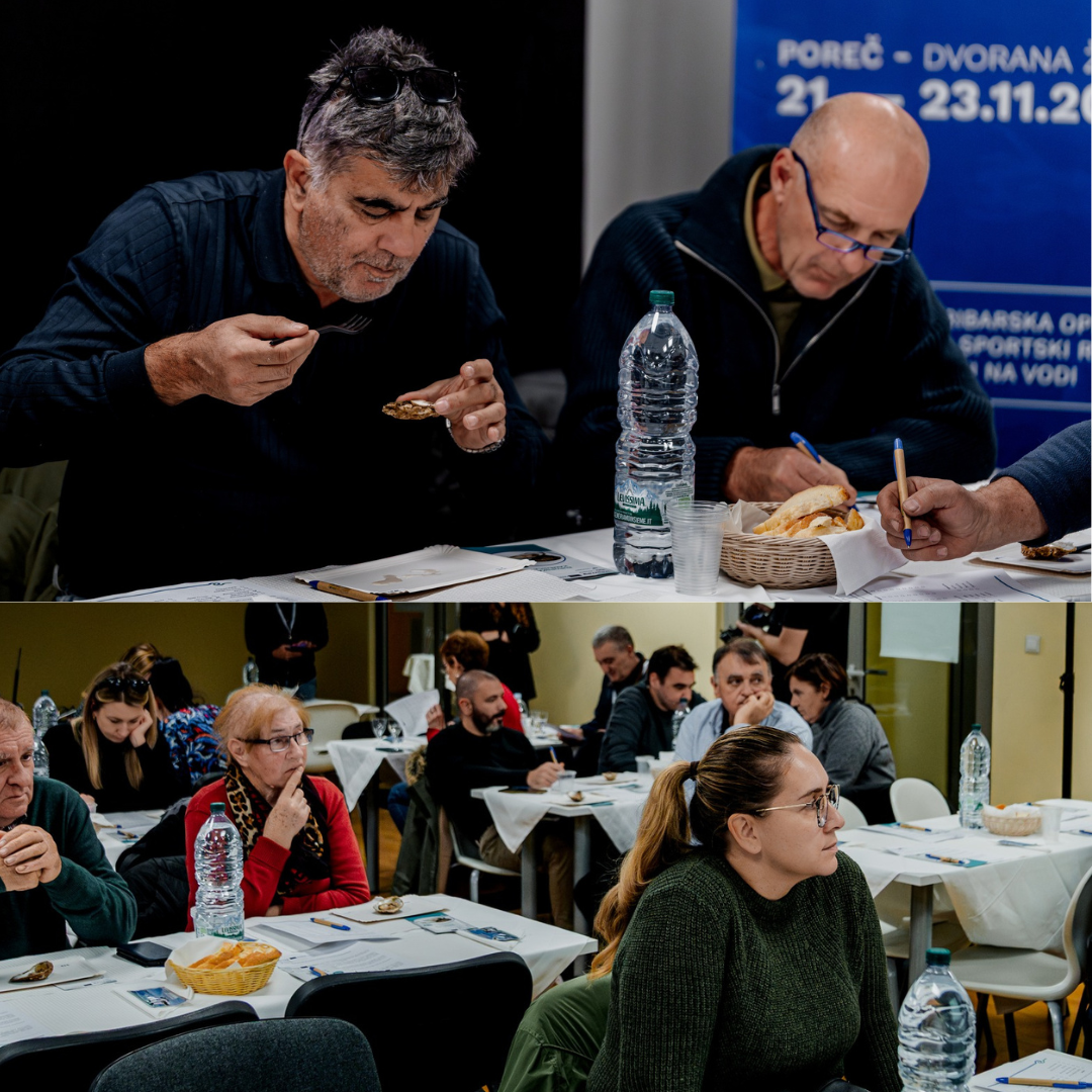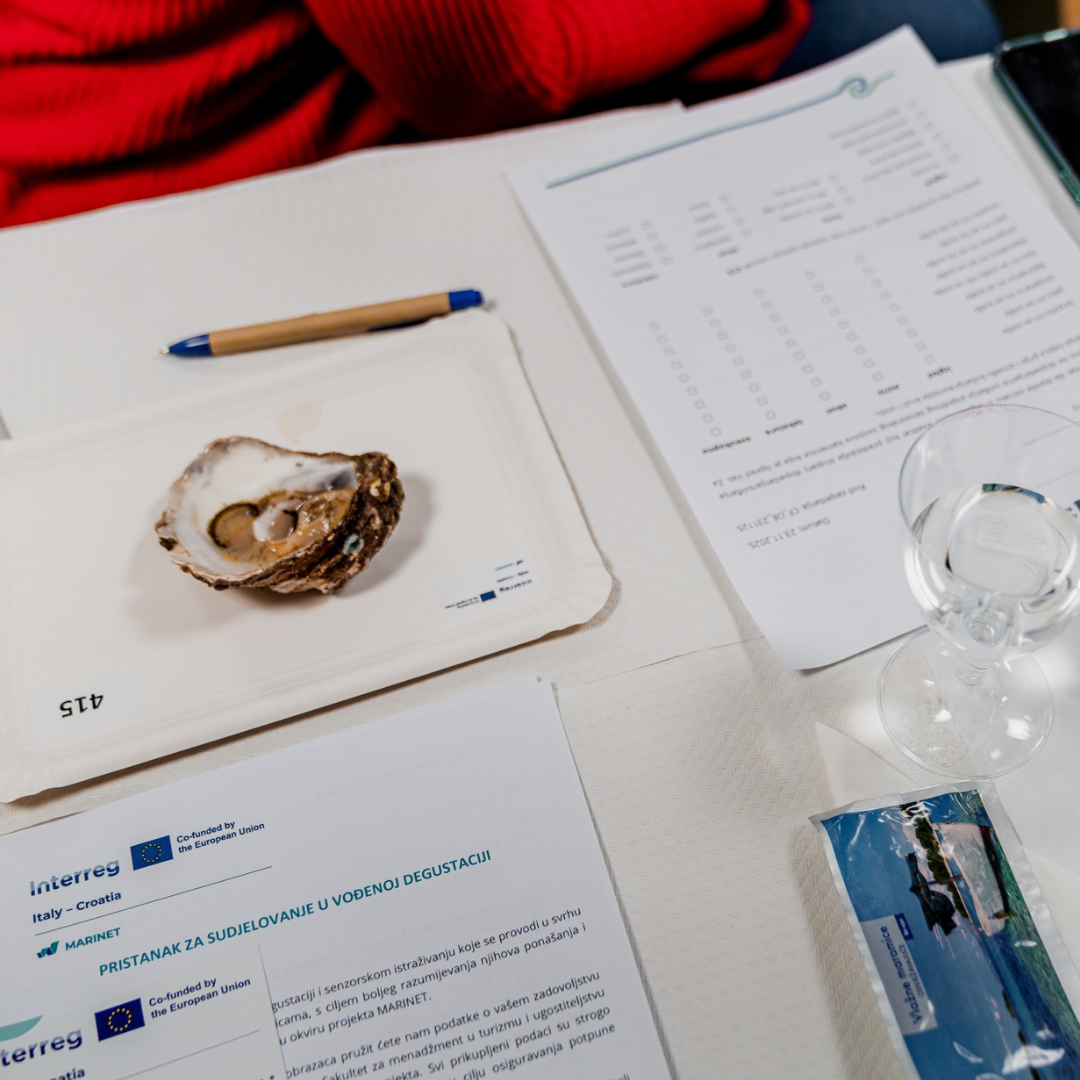 As part of the CROFISH Fair, the MARINET project organised a guided oyster tasting on Sunday, 23 November 2025, with two sessions at 10:00 and 12:00 (duration: 45 minutes), held in the Žatika Hall. Participants had the opportunity to taste two Adriatic flat oysters originating from two Croatian sites—Budava and Lim—where the project is testing new production methods and monitoring oyster growth. During the session, attendees also learned how to assess oyster quality and key sensory characteristics.