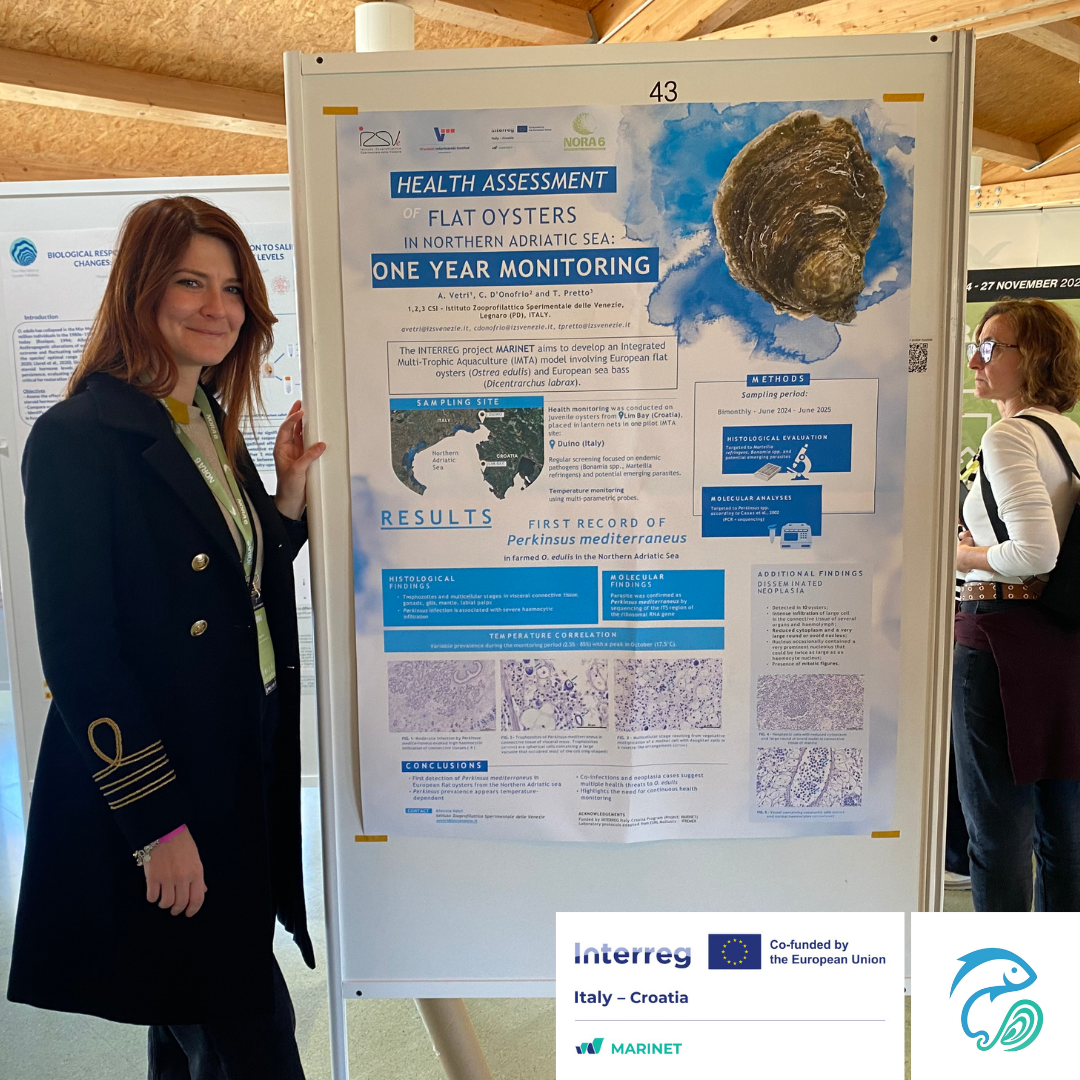 Within this international framework, Dr. Alessia Vetri, researcher at the Istituto Zooprofilattico Sperimentale delle Venezie (IZSVe), presented some preliminary results of the MARINET Project through a scientific poster entitled “Health Assessment of Flat Oysters in the Northern Adriatic Sea: One Year Monitoring”. The contribution summarized the results of one year of health monitoring activities carried out on Ostrea edulis at an IMTA (Integrated Multi-Trophic Aquaculture) site located in the Northern Adriatic Sea.