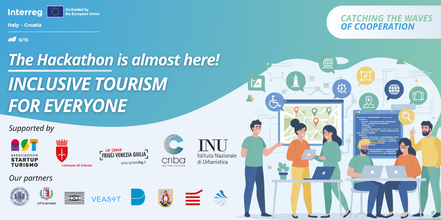 The Hackathon is organised by the University of Trieste in the framework of the SITE project (Shaping Inclusive Tourist Experiences), co-funded by the Interreg Italy–Croatia Programme 2021–2027, with the essential support of Startup Turismo, the Municipality of Trieste, CRIBA FVG and PromoTurismo FVG, and with the patronage of INU – National Institute of Urban Planning.