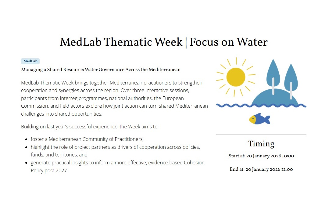 MedLab Thematic Week (20–22 January 2026, 10:00–12:00 CET) is an event focused on cooperation, project capitalization, and strengthening synergies across Interreg programmes in the Mediterranean. The programme is structured around three thematic areas: Water, Islands, and Skills.