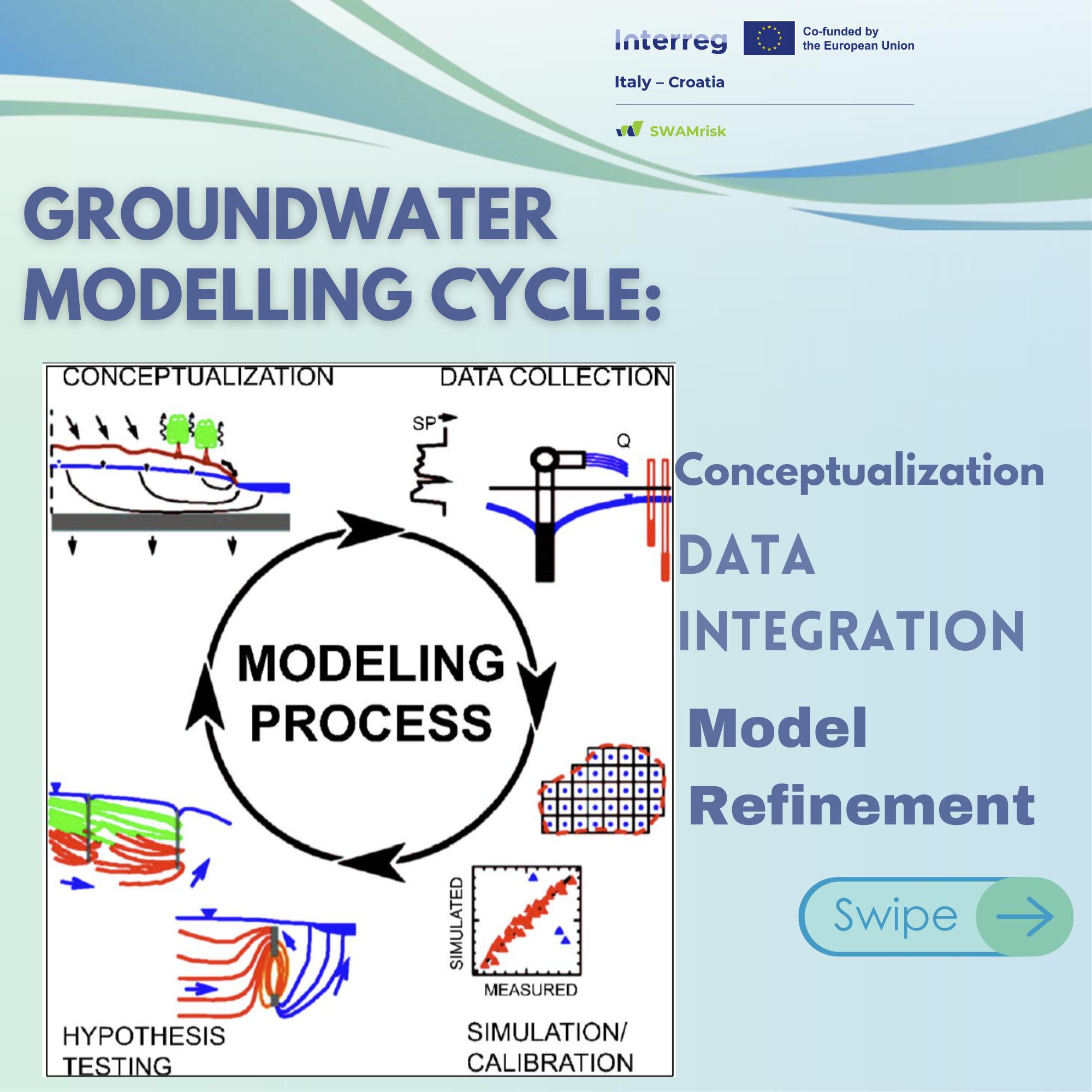 The process starts with a conceptual model that defines subsurface geometry, boundaries, and hydrogeological properties based on field and geophysical data. This framework is then translated into a mathematical model to predict groundwater dynamics. A key challenge is that end-users often struggle to understand the model’s assumptions and limitations if not directly involved in its development.