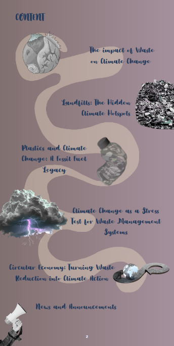The newsletter examines this topic through several key perspectives, including the role of landfills as contributors to global warming, the complex relationship between plastics and climate change, and the growing pressures climate change places on waste management systems. It also highlights the circular economy as a key solution, showing how waste reduction, resource efficiency, and circular practices can help lower emissions and mitigate climate impacts.
